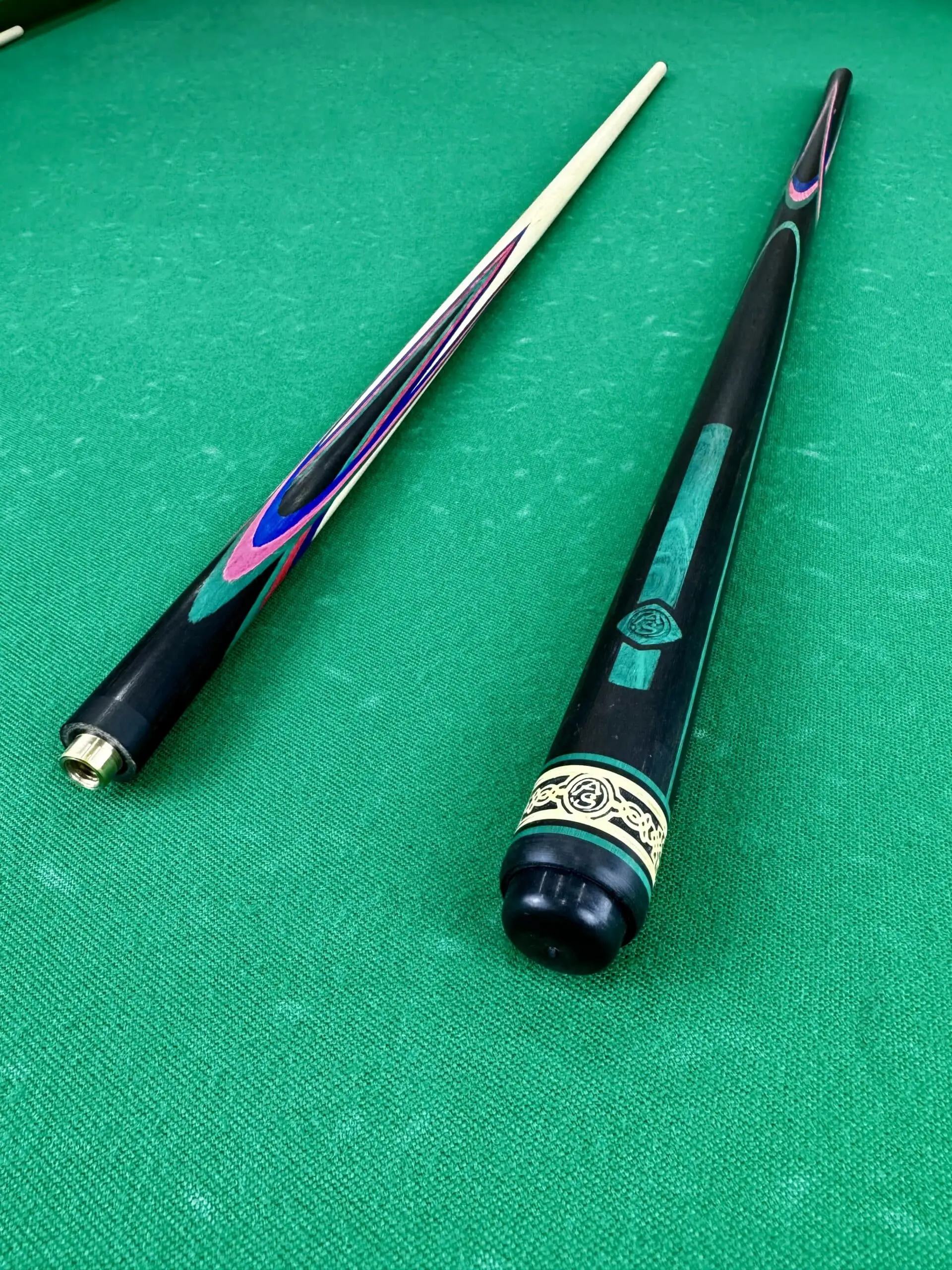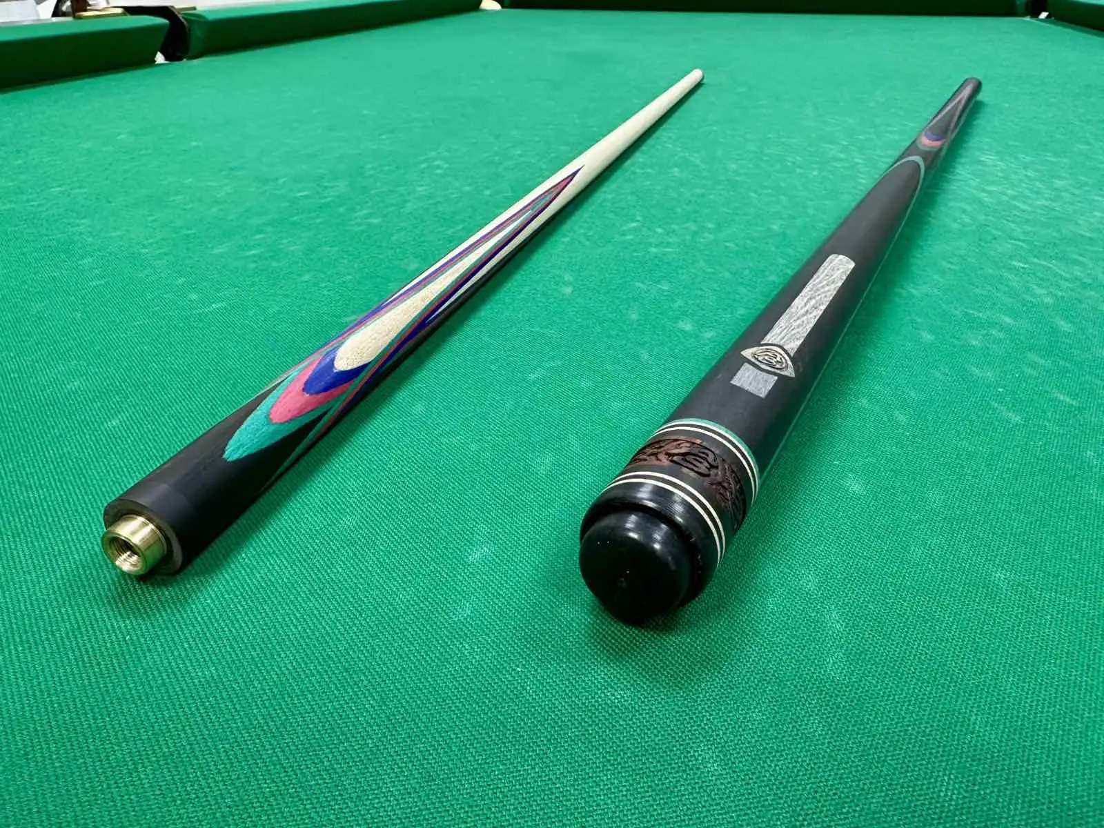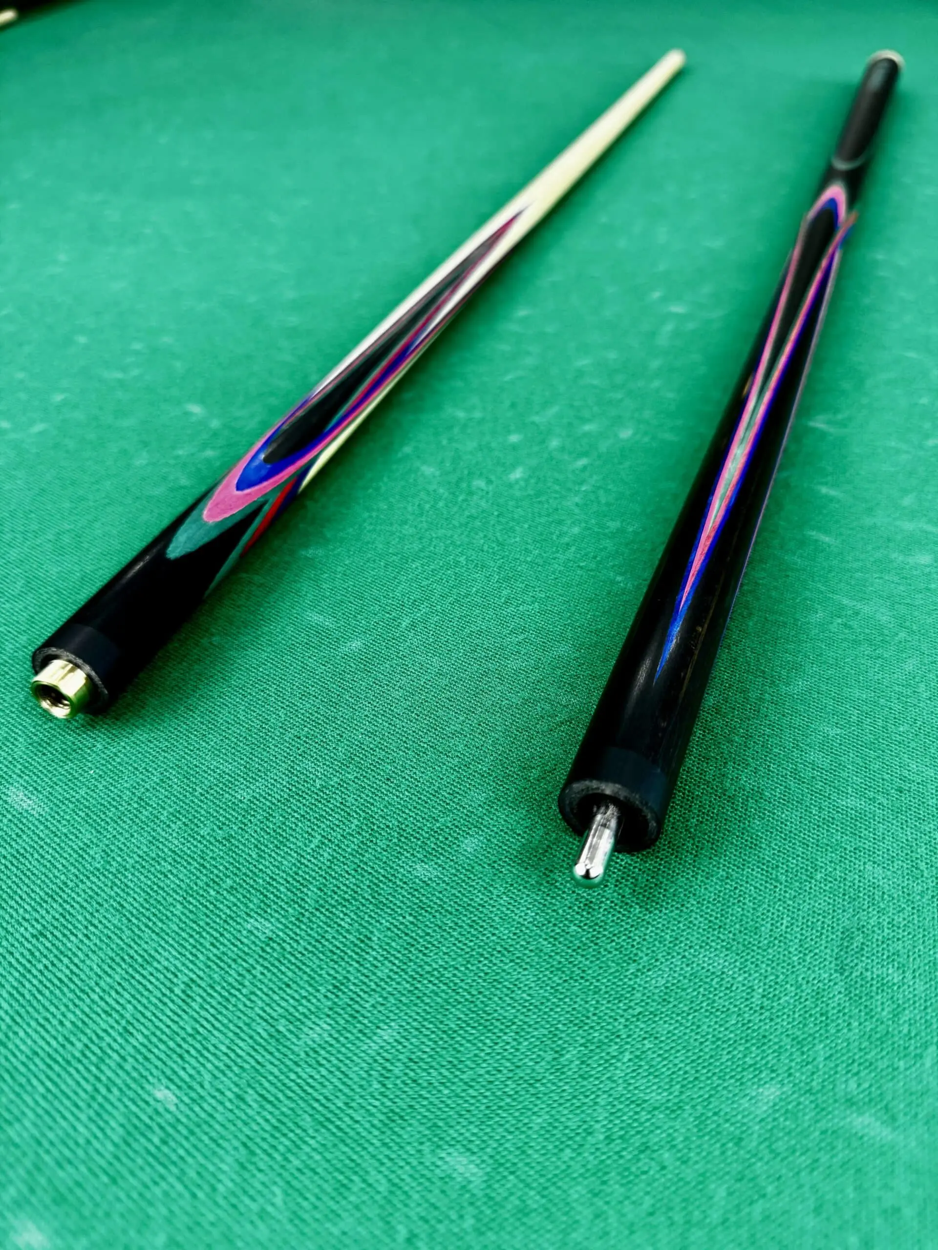 Дополняющие цвета — малиновый, синий и зеленый граб — играют важную роль в визуальном восприятии кия. Эти яркие оттенки органично сочетаются с темным эбеном, создавая эффект живописного цветка или экзотического попугая. Такая цветовая палитра не только привлекает внимание, но и подчеркивает индивидуальность владельца.