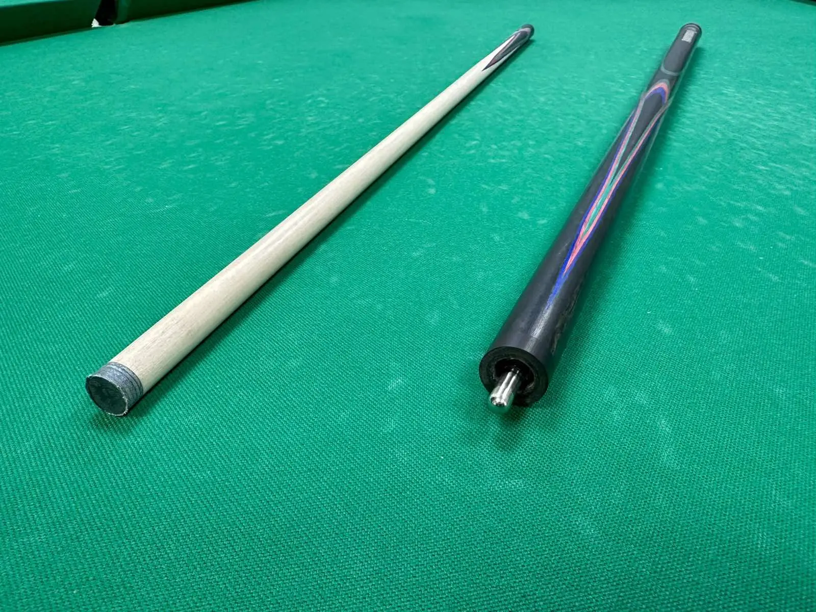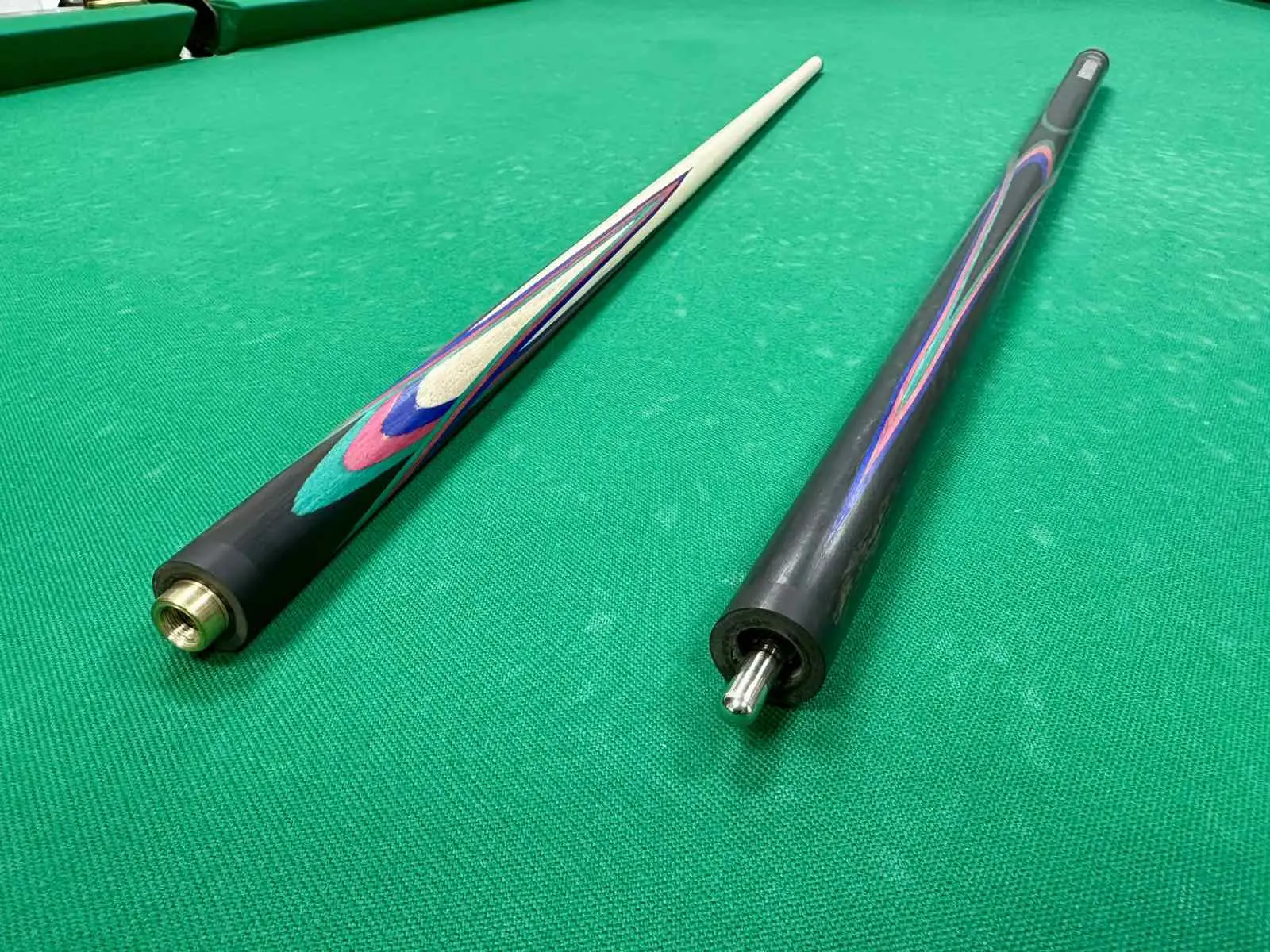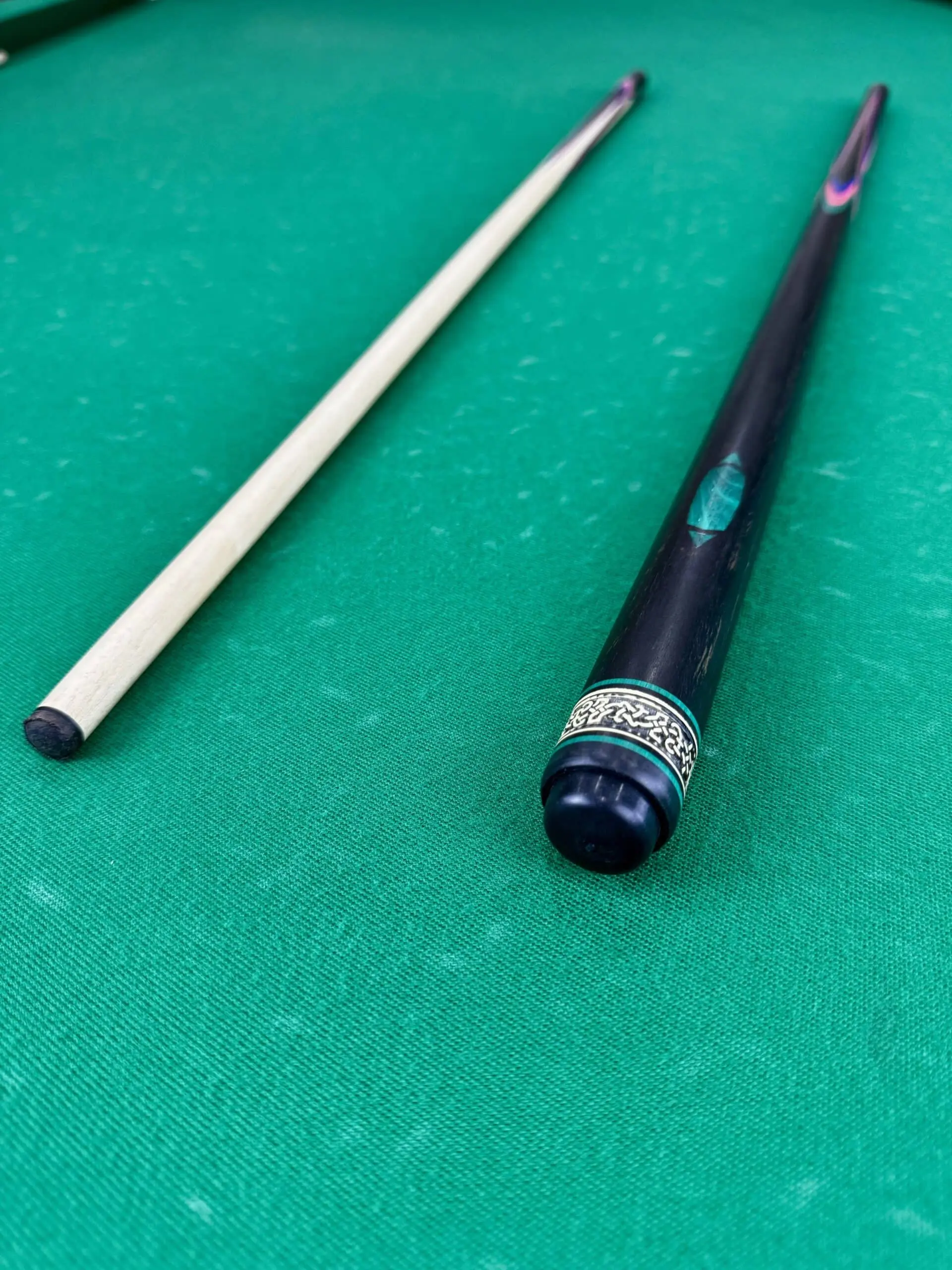 Дополняющие цвета — малиновый, синий и зеленый граб — играют важную роль в визуальном восприятии кия. Эти яркие оттенки органично сочетаются с темным эбеном, создавая эффект живописного цветка или экзотического попугая. Такая цветовая палитра не только привлекает внимание, но и подчеркивает индивидуальность владельца.