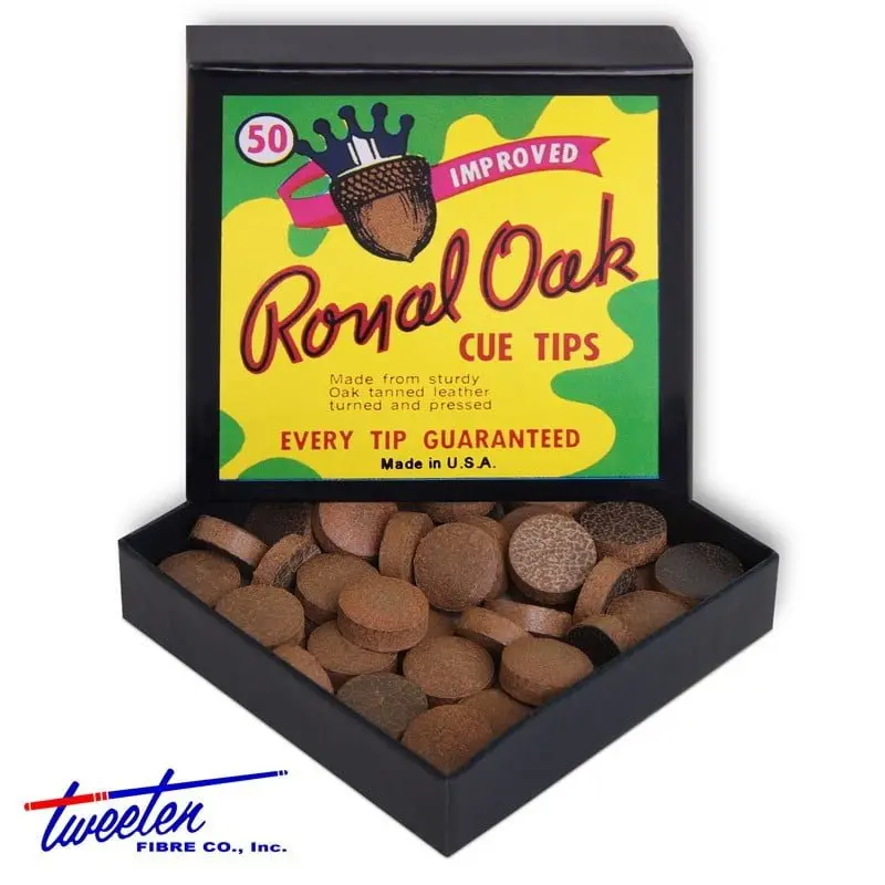 Наклейка для кия Royal Oak («Королевский дуб») в запоминающихся своим дизайном ярких упаковках с жёлудем на крышке выпускаются Tweeten Fibre Co – американской компанией, которая является сегодня настоящим «королём» на рынке бильярдных аксессуаров: её продукцию знают и используют игроки в бильярд различного класса во всём мире.
