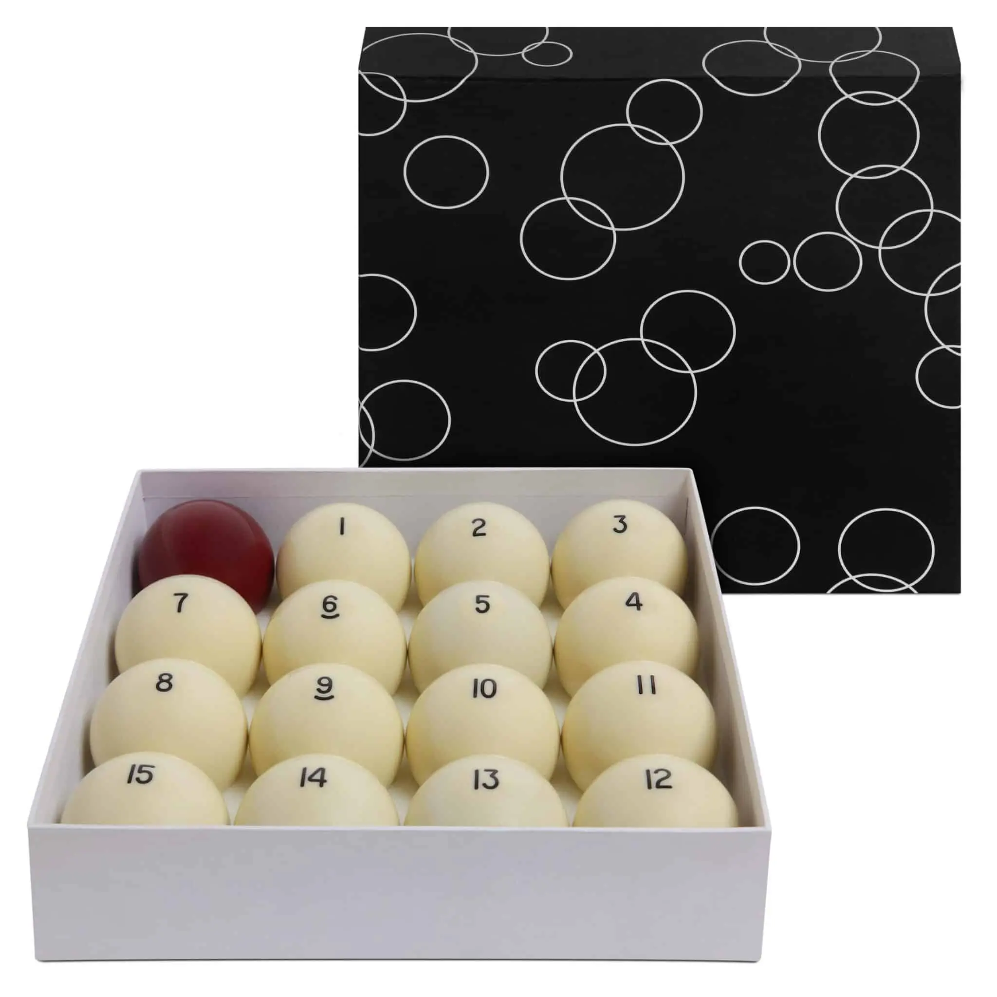 В наборе 15 шаров и биток стандартного размера 60 мм, упакованных в картонную коробку.