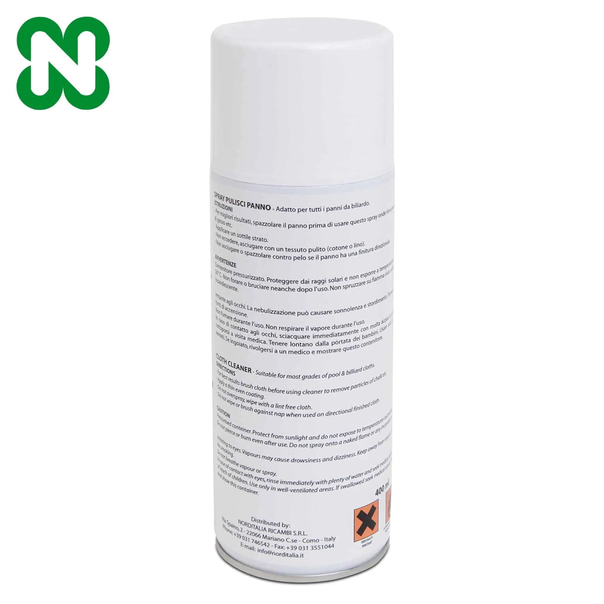 Средство для чистки сукна Nir Cloth Cleaner изготовлено известным итальянским производителем бильярдных киев и аксессуаров. Объем средства в металлическом флаконе-спрее 400 мл.