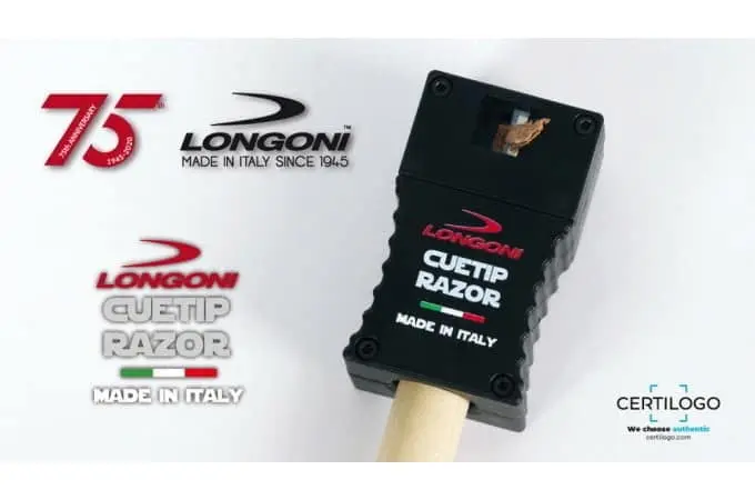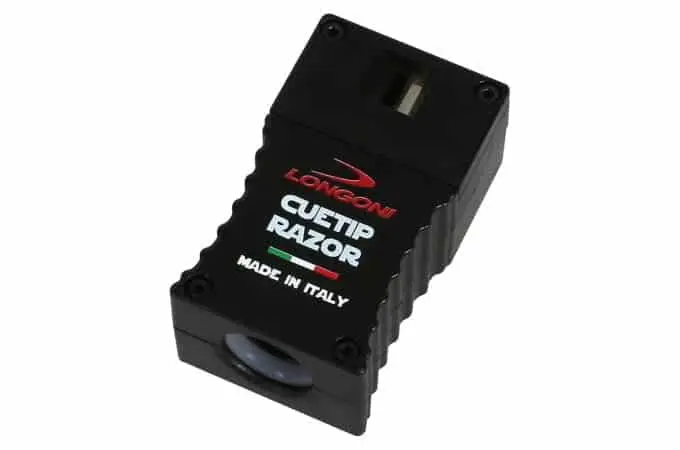 Виготовлений в Італії, багатофункціональний інструмент для обробки наклейки Edger Longoni Cuetip Razor складається з пластикового корпусу, сталевого леза і містить абразивну поверхню для надання сфери. Призначений для обробки країв більярдної наклейки і надання їй сфери діаметром від 11,8 до 12,8 мм: