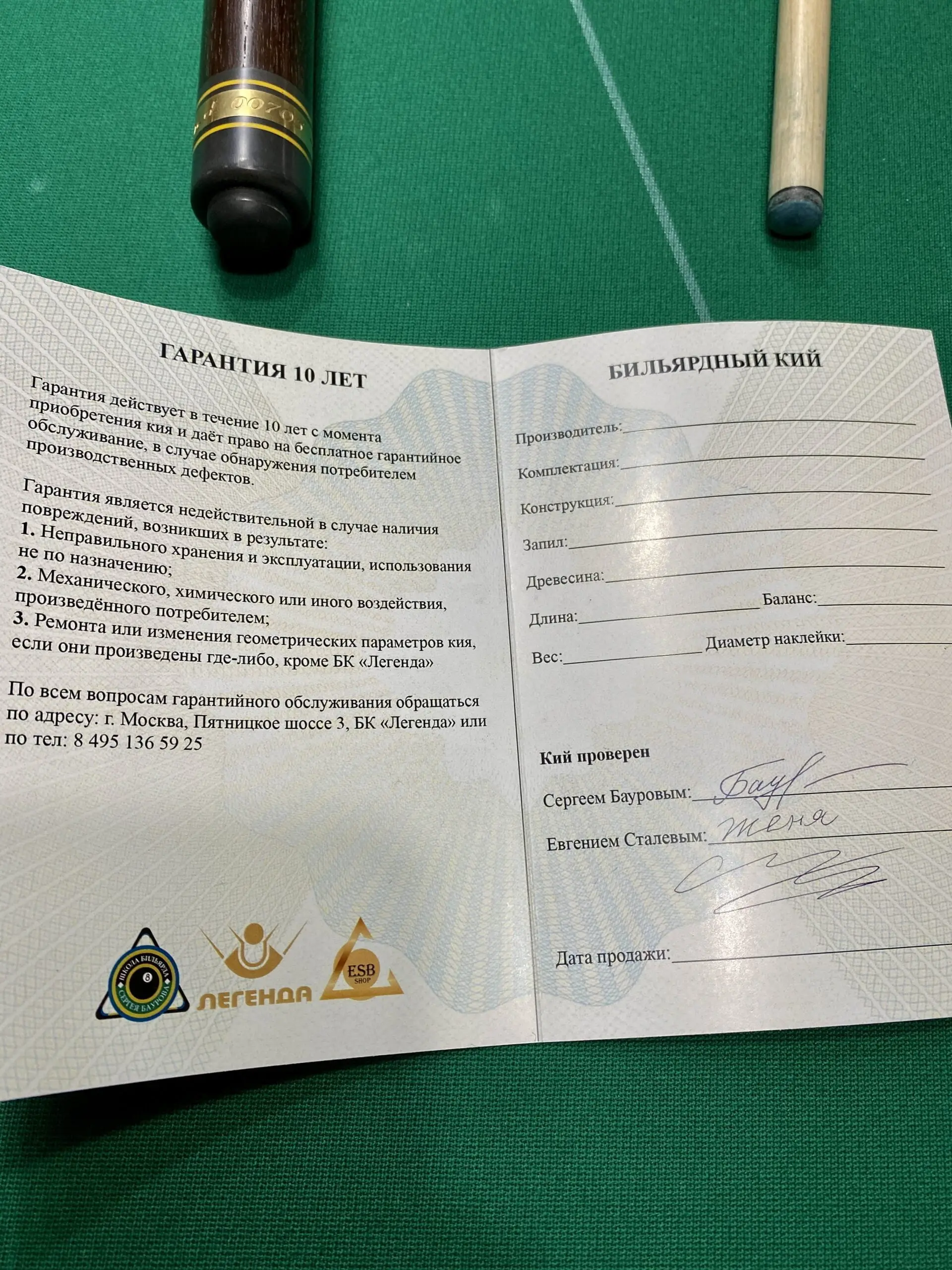 Кий перевіряються на ігрові властивості Старшим тренером із більярдного спорту Сергієм Бауровим, абсолютним чемпіоном світу Євгеном Стальовим та іншими професійними спортсменами.